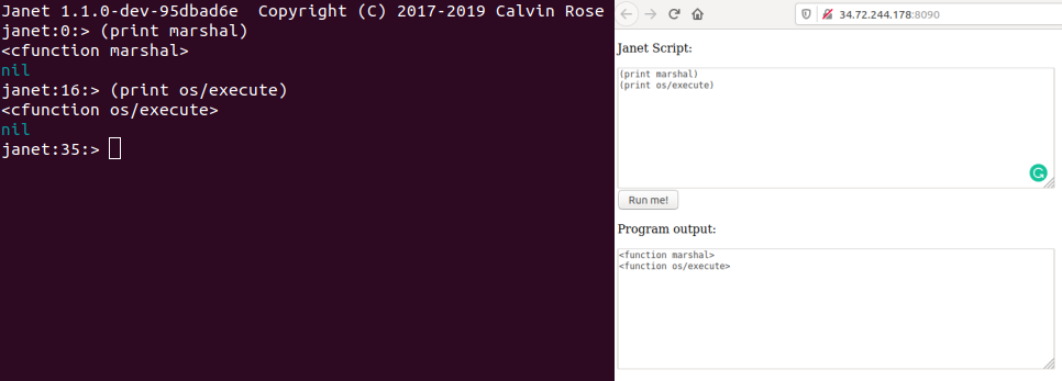 Running janet binary locally (left) and remote (right). Notice on remote cfunctions have became functions
