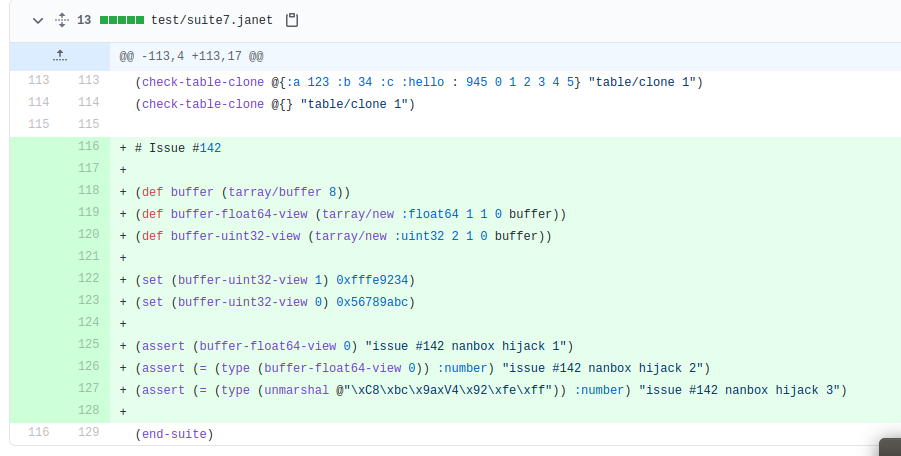 After a day of writing a semi-working deref leaking exploit, I realised that marshal was disabled on the target. Needless to say, that was pretty devastating. Some readers (especially those who solved the challenge) may be wondering, isn’t there another PoC above the unmarshaling from line 116-126 in the patch test/suit7.janet? For some incredible reason, only now in writing this post did I realise that I had complete ignored these lines while looking at the commit. In fact, I only stumbled upon that same PoC again because I was searching for the word ‘vulnerability’ in the repo’s issues. Facepalm. Anyways, pasting the typed array PoC into the challenge’s web prompt shows that it works.