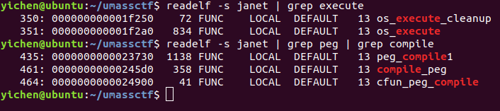 Symbols of os/execute and peg/compile are 0x1f2a0 and 0x24900 respectively